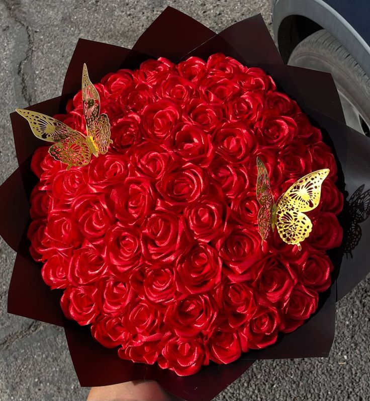 Ramo majestuoso con 80 rosas eternas de satín, elaboradas a mano con elegancia y detalle. Incluye 5 mariposas decorativas que aportan un toque mágico y vibrante. Disponible en la combinación de colores que prefieras, ideal para celebraciones especiales o como regalo inolvidable que transmite belleza, abundancia y emoción duradera.